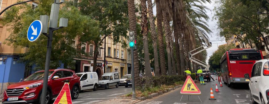 En les palmeres, els treballs consistiran en l'eliminació de palmes seques i fructificacions per raons de seguretat i neteja. Específicament en les washingtònies només s'eliminaran les palmes seques per davall dels 5 metres d’alçada, tal i com marquen els criteris tècnics. Pel que fa als ficus, s'efectuarà una revisió i si fóra necessària, una poda lleugera d'eliminació de branques trencades o seques i en la reducció o eliminació de branques que afecten façanes i serveics públics, així com un refaldat dels mateixos en cas d'interferències amb vianants o vehicles. Es durà a terme una poda que afavorisca la penetració de llum en els habitatges confrontants. Amb les acàcies del Japó es realitzarà poda per a evitar interferències amb les façanes, revisió i ocasionalment eliminació de branques seques.