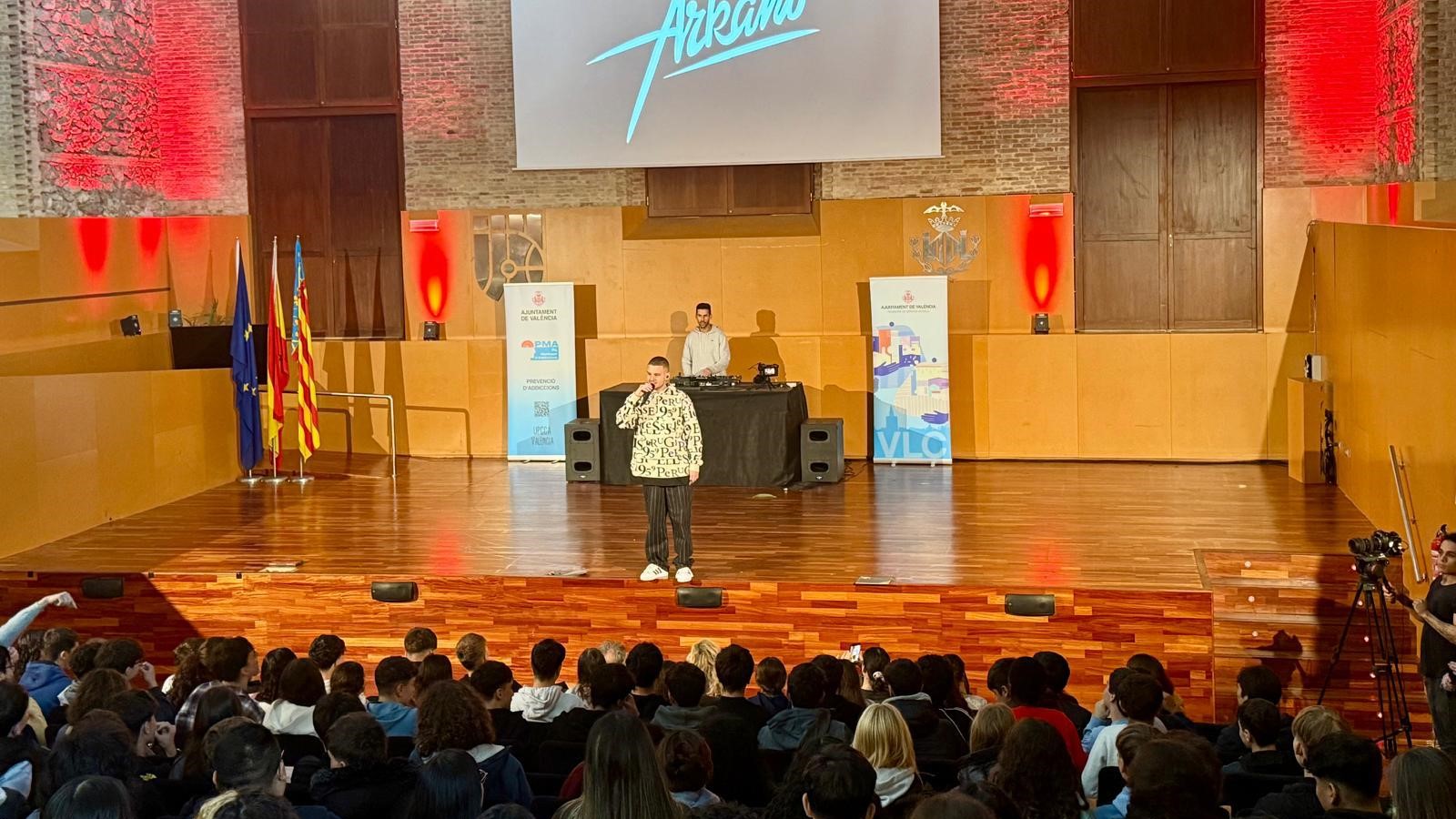 Durante la jornada, Arkano ha mantenido un diálogo abierto con el público y ha ofrecido un freestyle show participativo, en el que el alumnado ha aportado palabras y pensamientos que el artista ha convertido en improvisación, con el objetivo de generar un ambiente cercano y motivador.