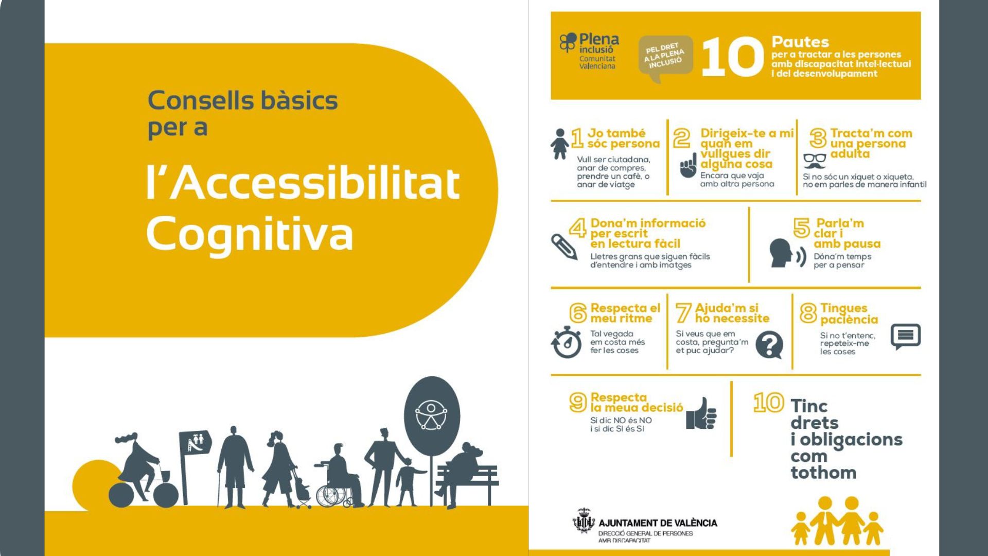 Por su parte, el Manual de Accesibilidad Cognitiva, elaborado por el Ayuntamiento de València, a través de la Dirección General de Personas con Discapacidad, es una herramienta de ayuda para el personal funcionario que implementa medidas que hacen fácil la comunicación y los entornos municipales a toda la ciudadanía. Ofrece una serie de consejos básicos en los que se aborda el propio concepto de accesibilidad cognitiva; los textos en lectura fácil; una señalética de los espacios municipales que facilite la movilidad, la orientación y evite las dificultades para el desplazamiento; la utilización de pictogramas de fácil comprensión y webs de fácil uso; y 10 pautas para tratar a las personas con discapacidad.