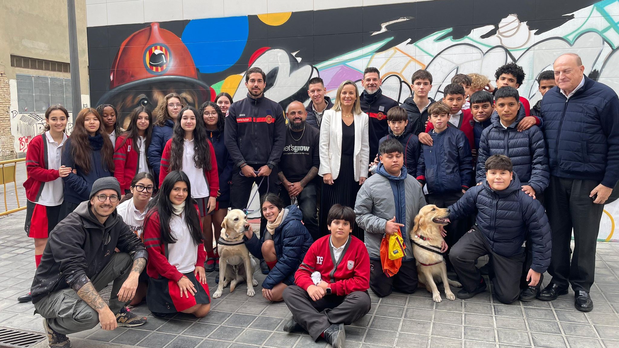 Como parte del encuentro, la unidad canina de los Bomberos de València se ha desplazado hasta el mural con varios de sus perros de rescate. El equipo profesional ha explicado a las y los jóvenes cómo trabajan en catástrofes, búsquedas de desaparecidos y situaciones de emergencia, así como la importancia del entrenamiento, la coordinación y el vínculo entre humanos y animales. El grupo de bomberos ha agradecido públicamente este homenaje, y han subrayado que se trata de “un reconocimiento que también refuerza la visibilidad de una labor vocacional y muchas veces desconocida”.
