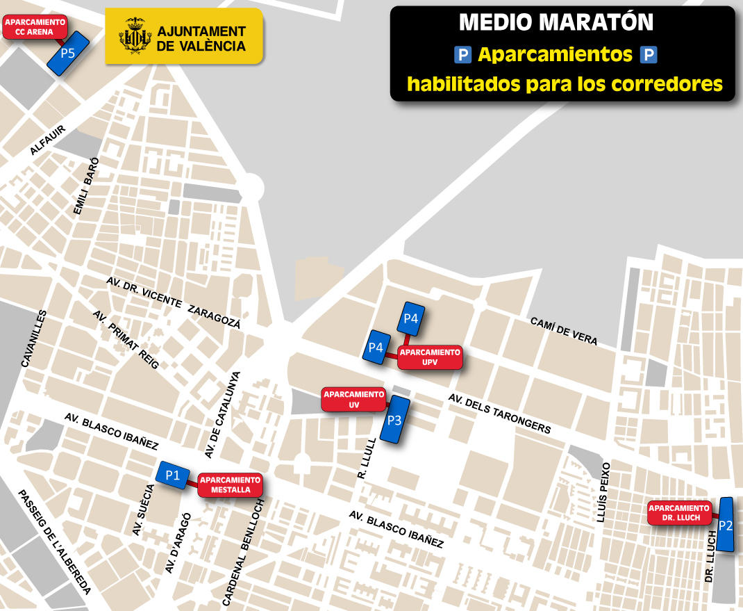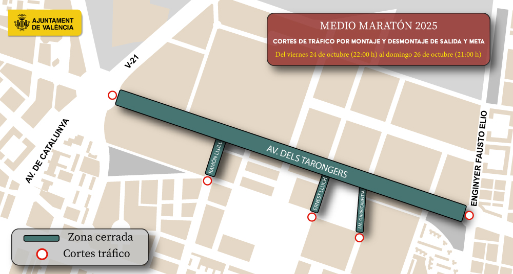 Afecciones al tráfico rodado: la avenida Naranjos, entre la V-21 e Ingeniero Fausto Elio, se cerrará en ambos sentidos para el tráfico rodado desde el viernes 24, a las 22:00 horas, hasta el domingo 26 a las 21:00 horas. El mismo domingo se cortarán los accesos por superficie a la rotonda de avenida Cataluña-Naranjos, desviándose el tráfico por el interior del túnel de la V-21, desde las 4:30 horas y hasta las 10:30 horas; mientras que el resto de los cortes del recorrido se realizarán a partir de las 7:30 horas.