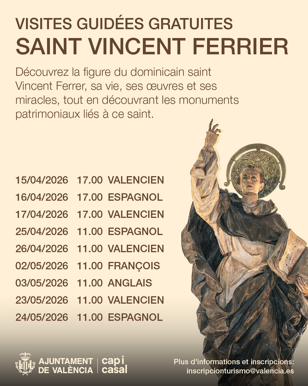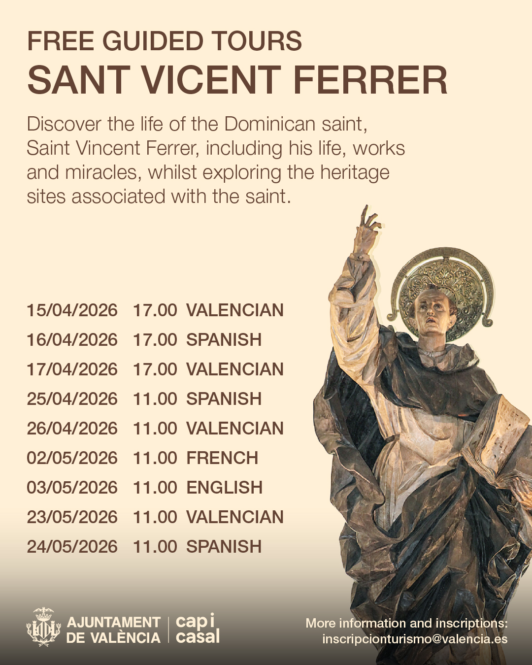 El Ayuntamiento ha puesto en marcha una nueva ruta turística que invita tanto a visitantes como a la ciudadanía a descubrir la vida y los milagros de San Vicente Ferrer, patrón de los valencianos y valencianas. San Vicente Ferrer es una de las figuras más relevantes e internacionales de València. Este dominico destacó durante el Siglo de Oro valenciano por su labor como teólogo, escritor y filósofo. Su obra y sus milagros alcanzaron gran reconocimiento en toda Europa, con especial presencia en su ciudad natal, donde aún se conservan diversos monumentos en su honor.