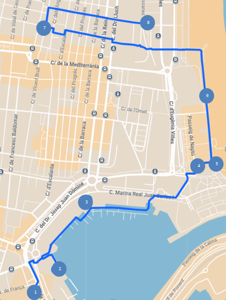 1. Antigua Estación de El Grau (pdf 611 kb).2. Estación Marítima (pdf 278 kb).3. Antigua Grúa Portuaria (pdf 599 kb).4. Restaurante La Pepica (pdf 670 kb).5. Merenderos (pdf 603 kb).6. Platja de les Arenes (pdf 607 kb).7. Centro Cultural L’Escorxador (pdf 591 kb).8. Museo del Mar – Casa dels Bous (pdf 613 kb).