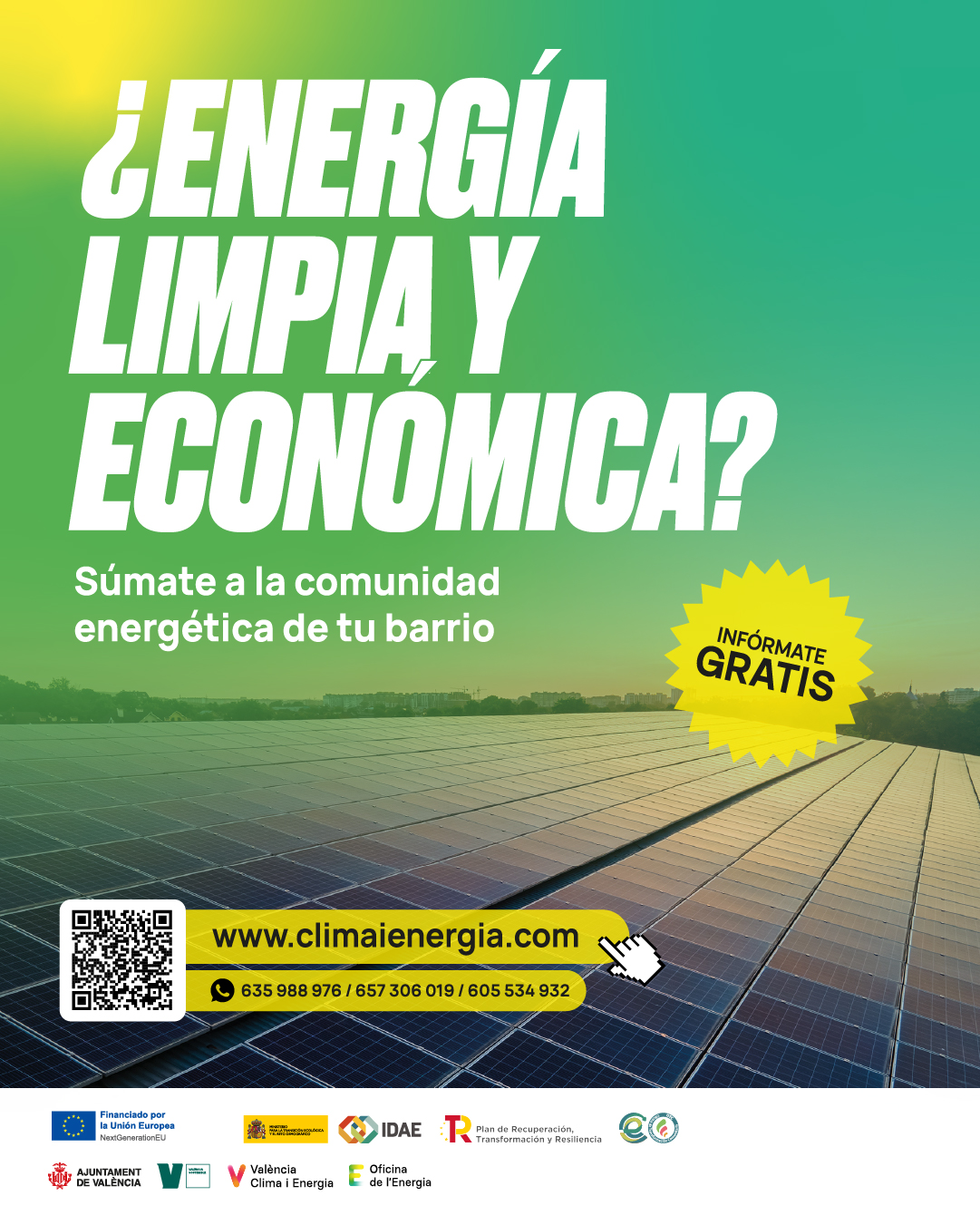 El Ayuntamiento de València, a través de la Fundació València Clima i Energia quiere ampliar la constitución de comunidades energéticas locales. El objetivo de una comunidad energética es ofrecer beneficios energéticos a sus miembros, pero también genera beneficios medioambientales, económicos y sociales para el barrio en el que funciona y para toda la ciudad. Desde el Ayuntamiento, a través de la Fundación València Clima i Energía, y con fondos europeos, se impulsa este modelo de generación y consumo de energía sostenible.