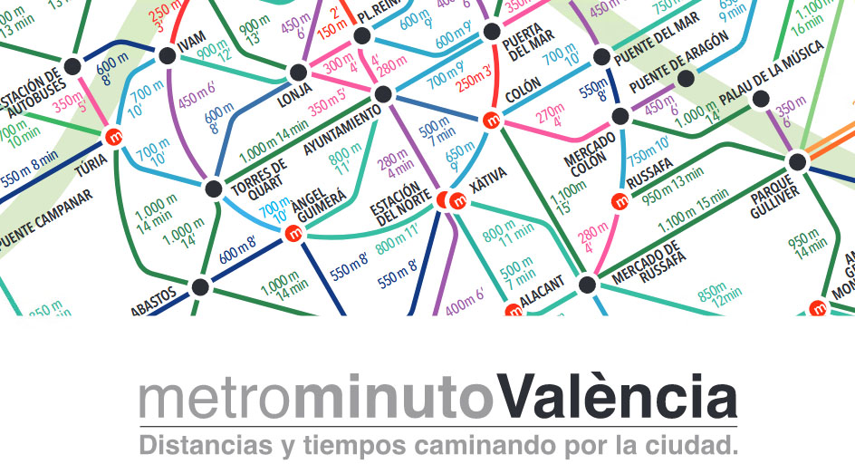 Metrominuto València es un mapa sinóptico que mide distancias y tiempos caminando y los expone mediante códigos visuales que se asemejan a los utilizados por el metro de las grandes ciudades. La idea es desdramatizar la cultura del andar mostrando que la mayor parte de los desplazamientos que realizamos en nuestro día a día pueden resolverse en trayectos de diez a quince minutos a pie.El primer Metrominuto nació en 2011 fruto de un laboratorio sobre movilidad peatonal en la ciudad de Pontevedra. La Red de Ciudades que Caminan, integrada por más de 90 municipios y provincias que representan a unas 10 millones de personas, ha adoptado la iniciativa como un medio interesante para difundir la cultura de la movilidad natural en las ciudades.