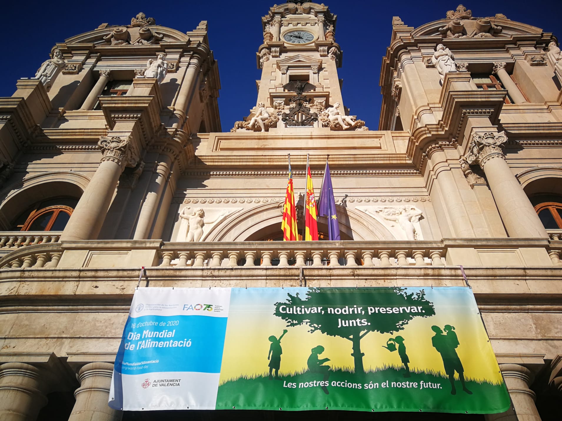 El Ayuntamiento de València se ha añadido a la conmemoración el Día Mundial de la Alimentación que se celebra hoy con el lema “Cultivar, nutrir y preservar, juntos”. Con motivo de esta fecha, la fachada del edificio consistorial luce una pancarta con este emblema que reivindica “la alimentación sostenible y de proximidad”, y recuerda que “nuestras acciones son nuestro futuro, por lo que hay que preservar nuestra tierra”, tal como ha defendido, en reiteradas ocasiones, el alcalde de València, Joan Ribó.