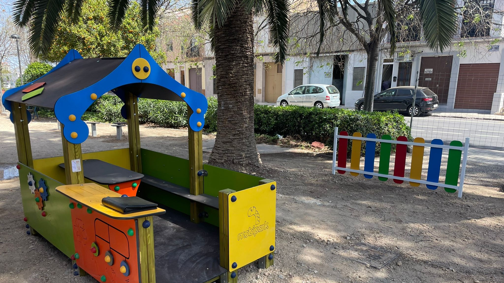 La actuación ha consistido en la instalación de tres juegos infantiles con las pertinentes medidas de seguridad en diseño y materiales: una casita con terraza, un conjunto de seis pivotes de equilibrio y un pasadizo. Además, se ha habilitado un vallado de protección de colores, y se han colocado carteles normalizados con la leyenda “Gossos no” y “Zona de jocs”.