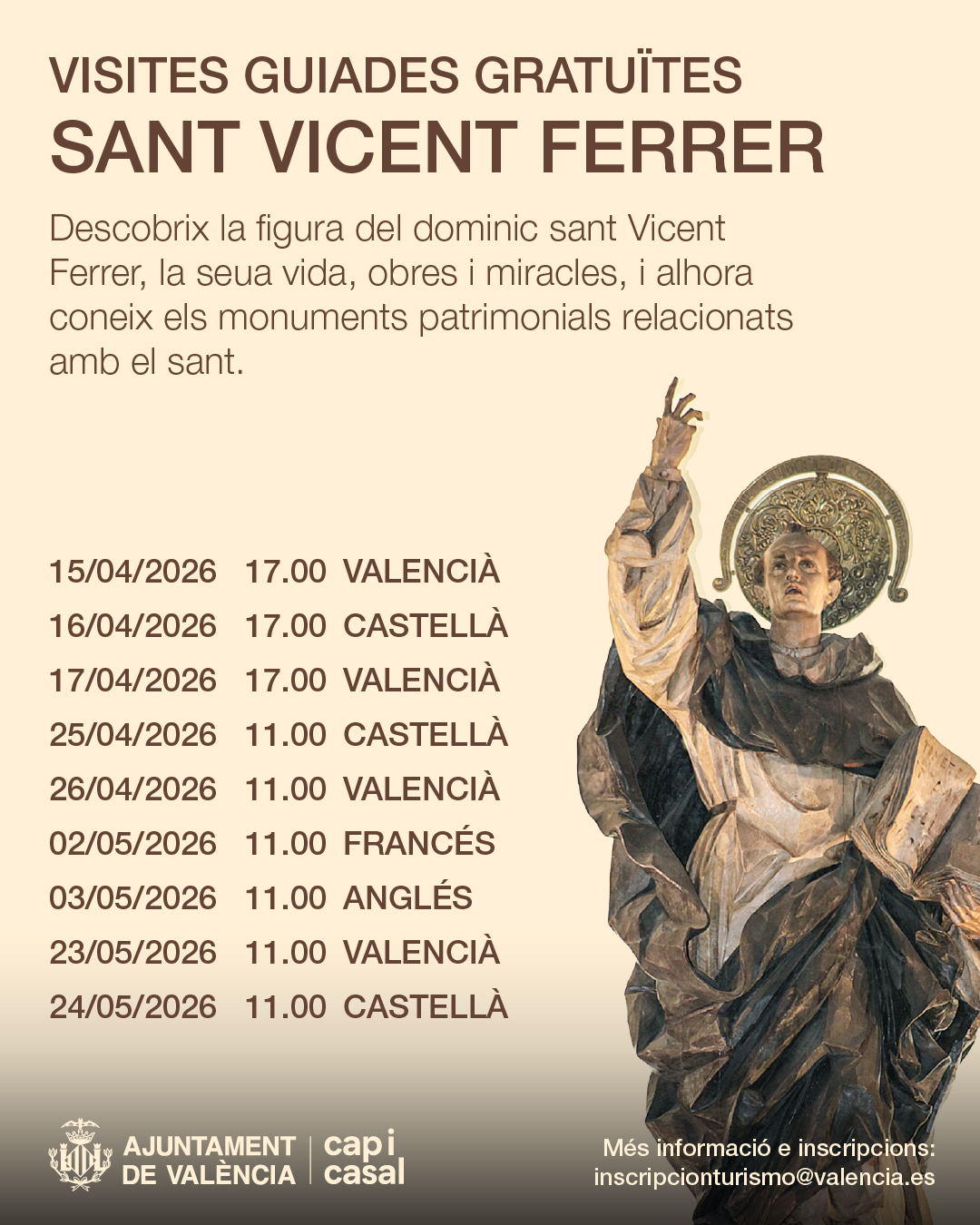 L'Ajuntament ha posat en marxa una nova ruta turística que convida tant a visitants com a la ciutadania a descobrir la vida i els miracles de Sant Vicent Ferrer, patró dels valencians i valencianes. Sant Vicent Ferrer és una de les figures més rellevants i internacionals de València. Aquest dominic va destacar durant el Segle d'Or valencià per la seua labor com a teòleg, escriptor i filòsof. La seua obra i els seus miracles van aconseguir gran reconeixement en tota Europa, amb especial presència a la seua ciutat natal, on encara es conserven diversos monuments en el seu honor.